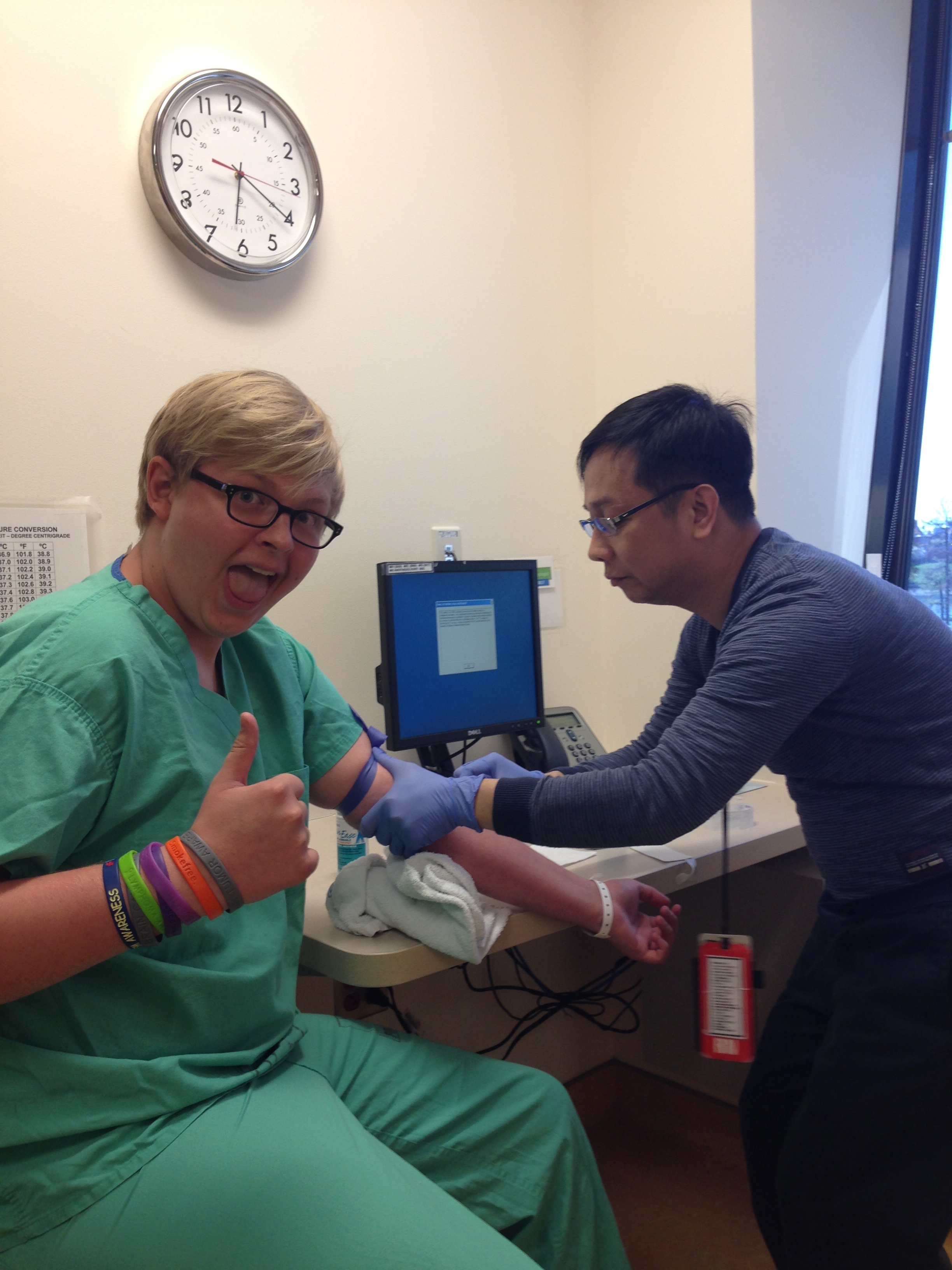 One of the nurses putting an IV in my arm before having an MRI! Gotta stay positive!